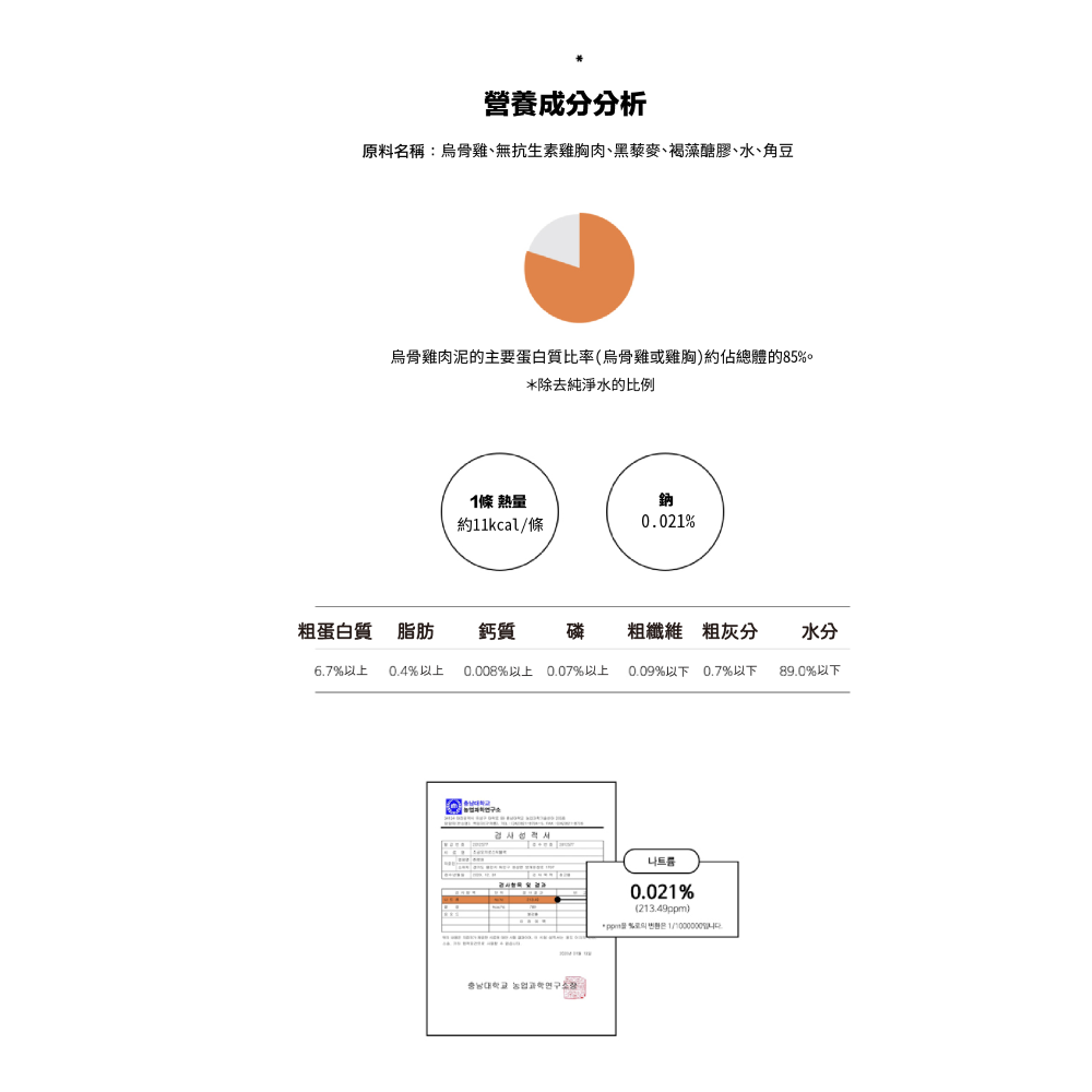 成分: 烏骨雞、雞胸肉(非抗生素)、黑藜麥、褐藻醣膠、水、角豆