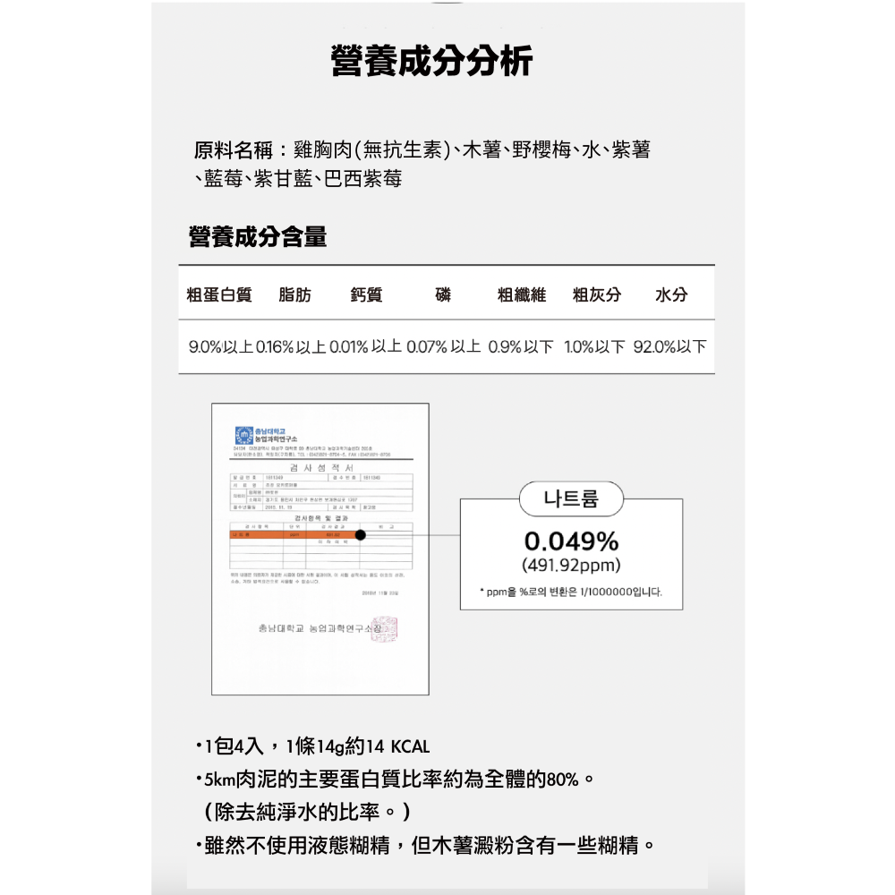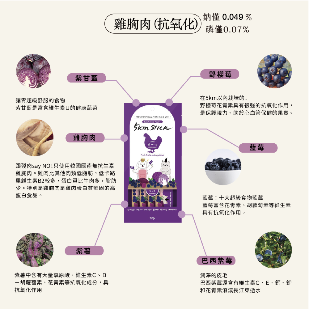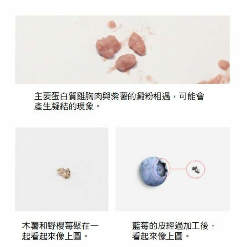 成分: 雞胸肉(非抗生素)、木薯、野櫻莓、水、紫薯、紫甘藍、巴西紫莓