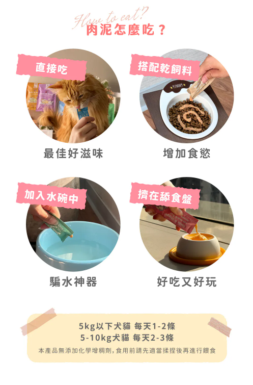 ▌餵食方式:直接餵食、搭配罐罐飼料、加入水碗