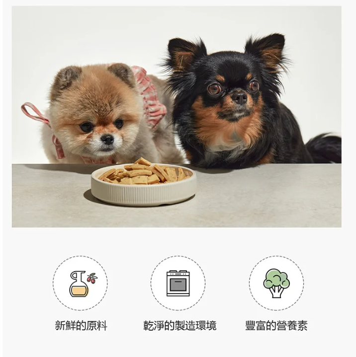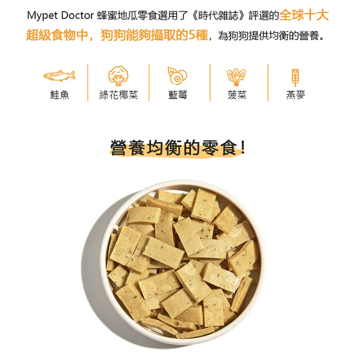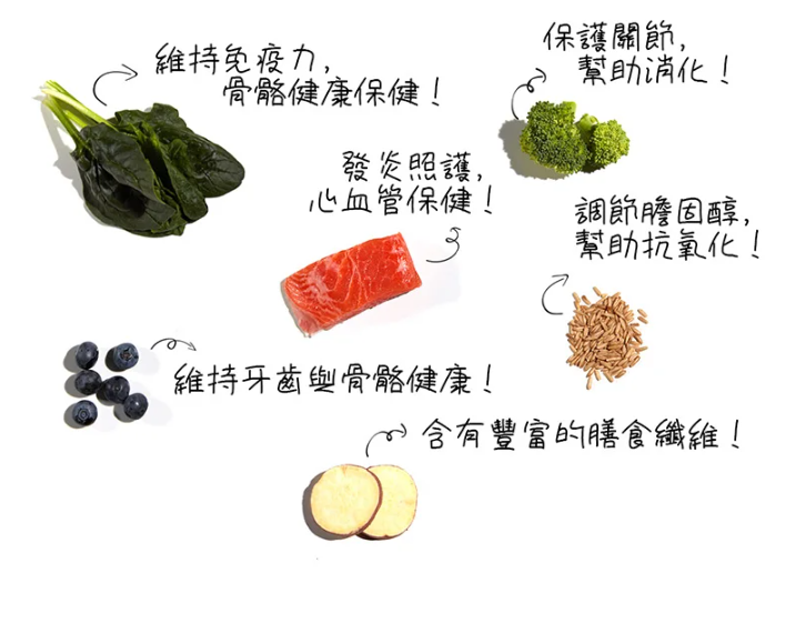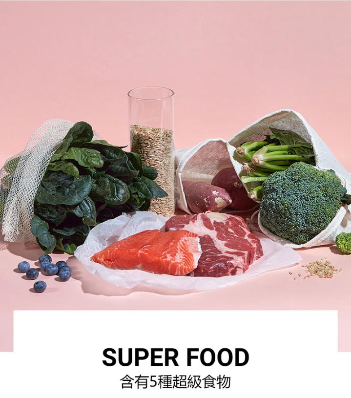 特別添加《時代雜誌》評選五大超級食物:鮭魚/花椰菜/藍莓/菠菜/燕麥,為狗狗提供均衡的營養。