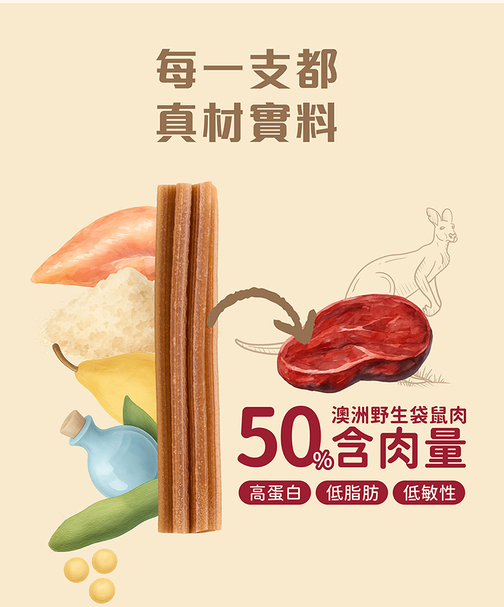 50%高含肉量(45%澳洲純袋鼠肉+5%雞肉)